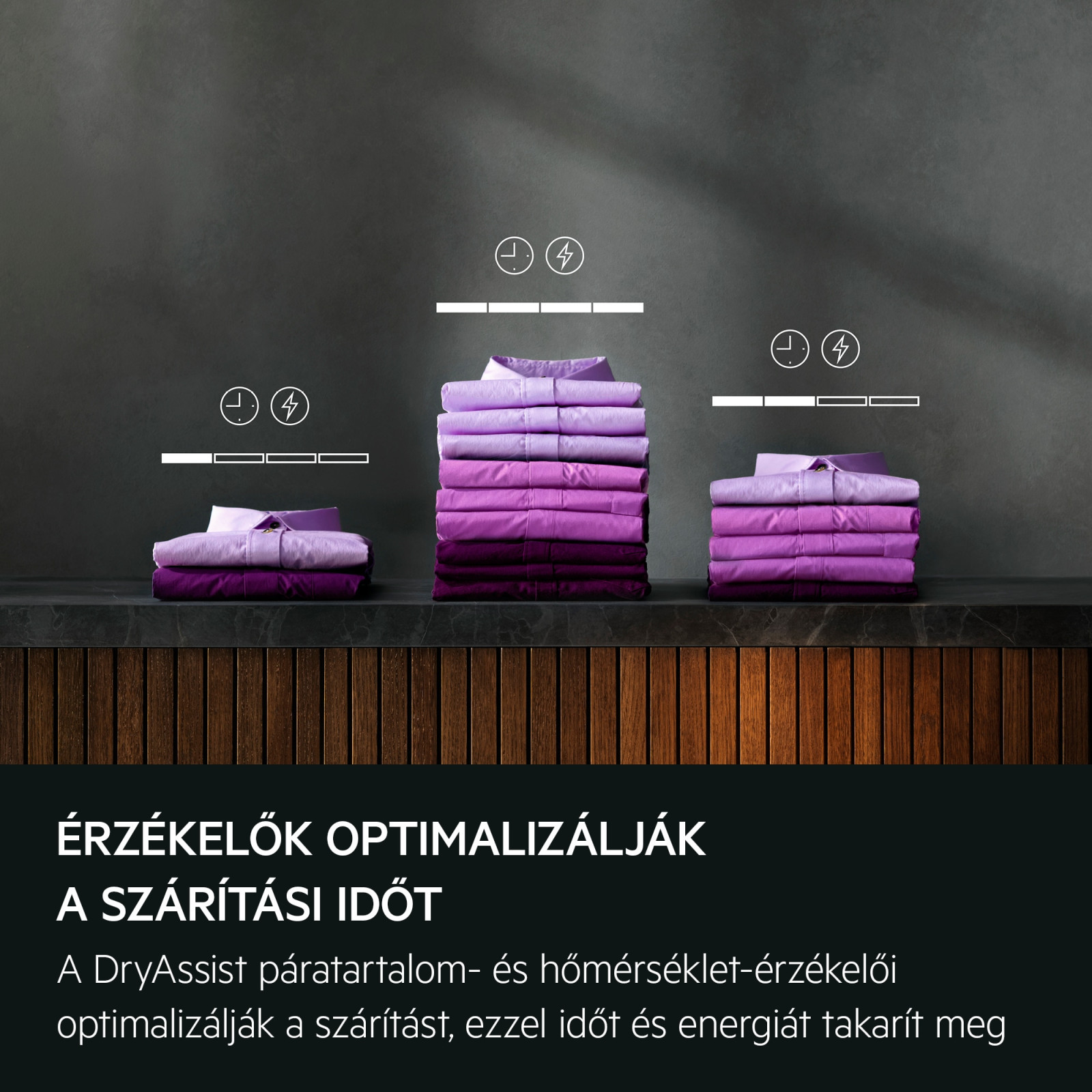 A nedvességérzékelők a töltet súlyához és nedvességéhez igazítják a program hosszát és az energiafogyasztást. Kis adagoknál sem pazarol.
