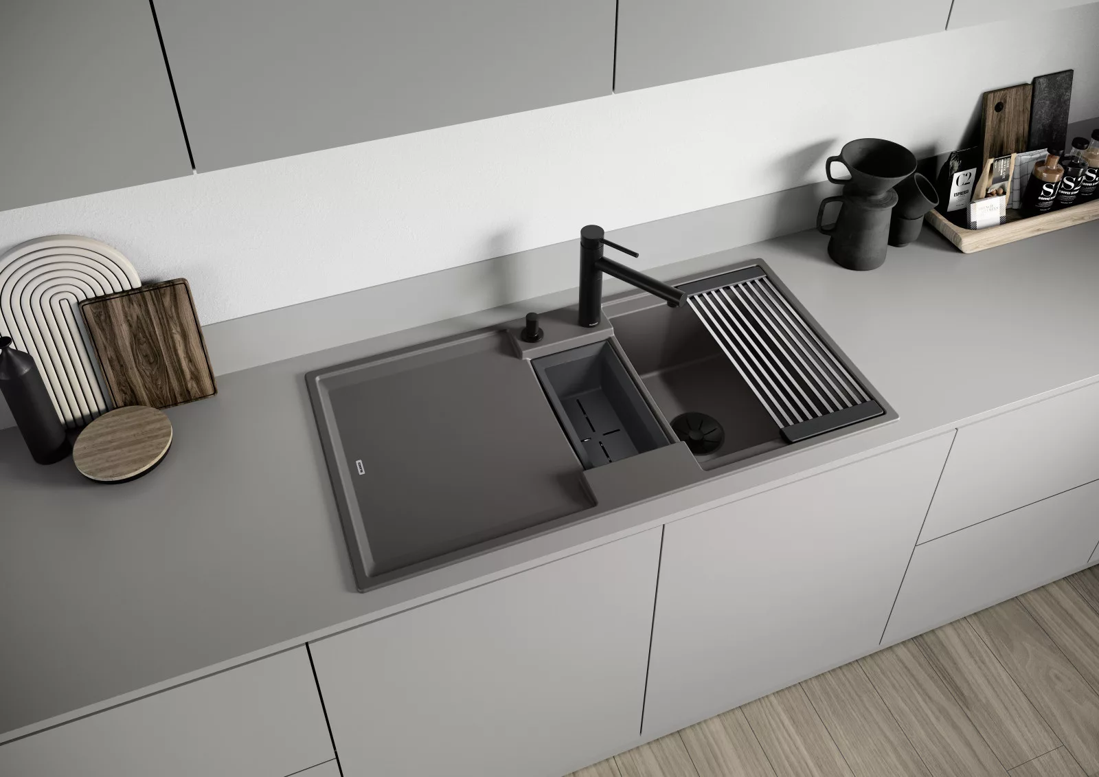 • Modern mosogató gyönyörű Silgranit színekben kibővített funkcionalistással