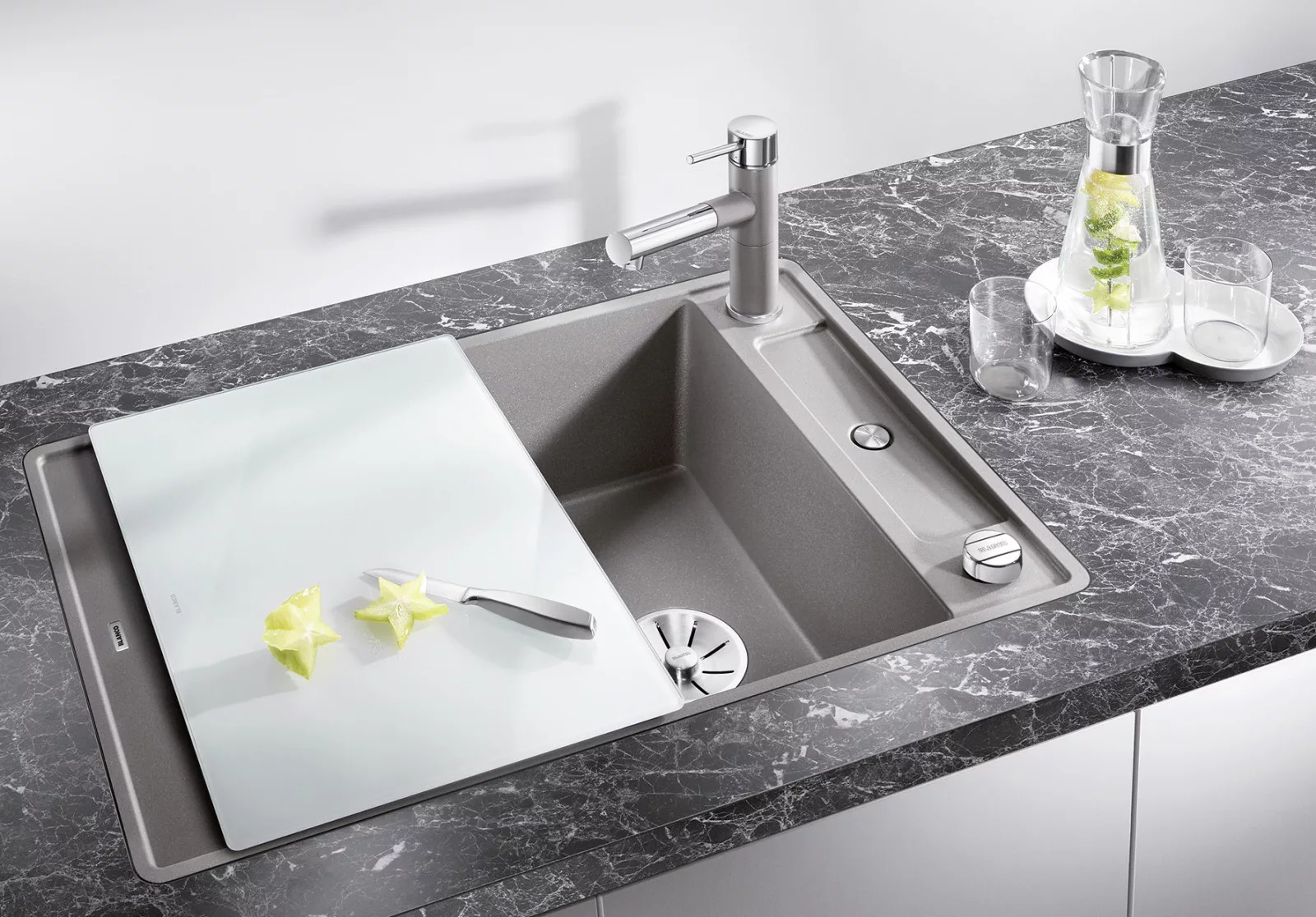 • Eltolható vágódeszka az előkészítéshez a főmedencén, a tálkán vagy a csepegtetőtálcán (választható üveg vagy többrétegű kőris kivitelben)