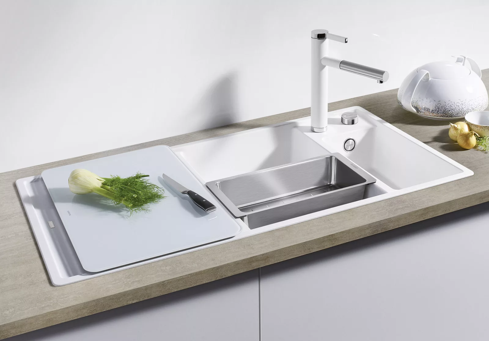 • Gazdag felszereltség lefolyó-távműködtetővel, C-overflow® túlfolyóval és InFino® szűrőkosárral – elegáns illeszkedés és különösen könnyű tisztíthatóság.