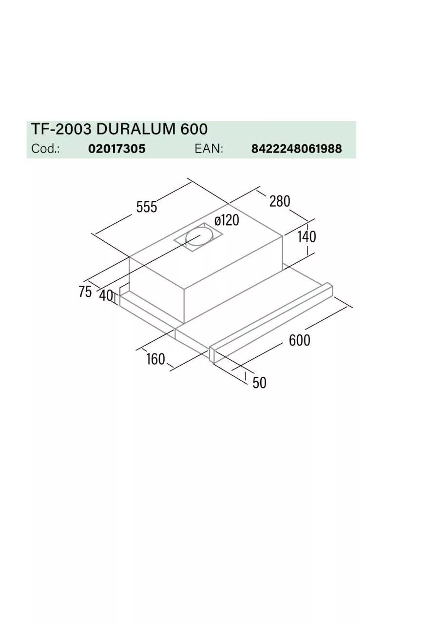 A CATA TF-2003 sorozatot arra tervezték, hogy beszerelhető legyen egy konyhabútor felső szekrénybe. Beépítése gyors és egyszerű, a tetején és az oldalán is található rögzítési pontoknak köszönhetően. A távtartó a páraelszívó és a fal között távolság áthidalására szolgál. A páraelszívó dobozában megtalál minden tartozékot a készülék felszereléséhez. Előlapja levehető, így akár konyhabútor anyagával azonos előlap is felszerelhető. Az elszívott levegő a szabadba egy csővezetéken keresztül távozik, (kivezetéses üzemmód) amit egy 120 vagy 125 mm átmérőjű nyíláshoz kell csatlakoztatni egy csőcsonk segítségével. Tilos égéstermékek céljára használt csatornákba, kéményekbe bevezetni!