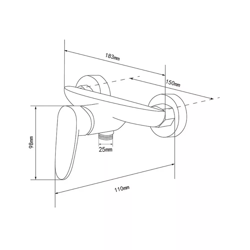 • Méretek: teljes szélesség 183 mm, falitávolság 150 mm, magasság 98 mm, kifolyó hossza 110 mm, kimeneti átmérő 25 mm