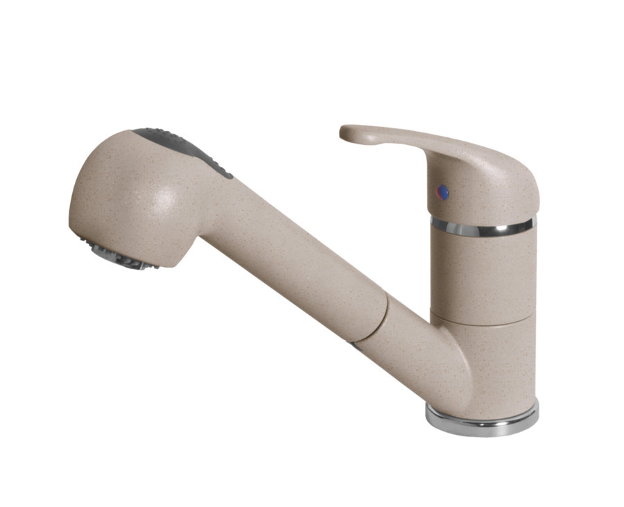 Egykaros csaptelep forgatható kifolyócsővel, kerámiabetéttel, kihúzható zuhanyfejjel és kétféle vízsugárral (zuhany / normál).