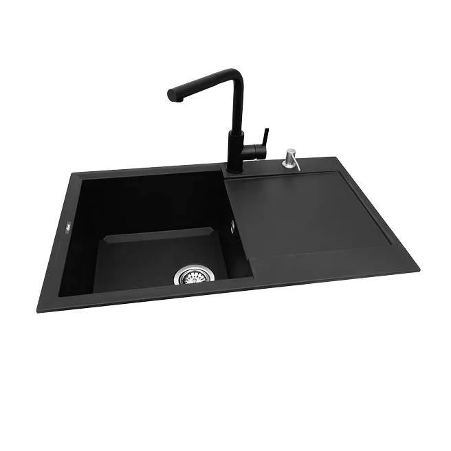 1 medencés mosogatótálca csepegtetővel, munkalapra szerelhető, anyaga: granitek, színe: G40 Nero, mosogatótálca mérete: 790x500 mm, medence mélysége: 220 mm, tartozékok: helytakarékos szifon, szűrőkosár, rögzítő fülek, elleci túlfolyó, 10 év garancia