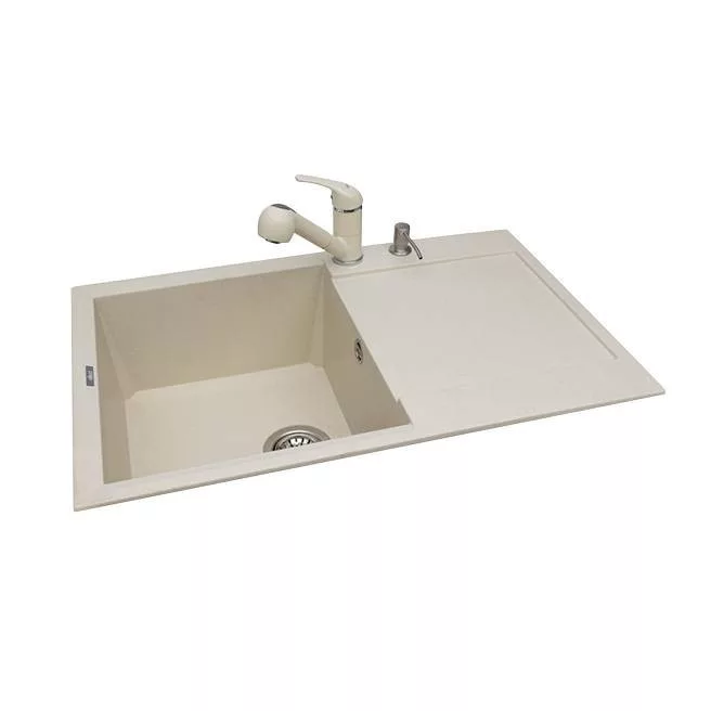 1 medencés mosogatótálca csepegtetővel, munkalapra szerelhető, anyaga: granitek, színe: G62 bianco antico, mosogatótálca mérete: 790x500 mm, medence mélysége: 220 mm, tartozékok: helytakarékos szifon, szűrőkosár, rögzítő fülek, elleci túlfolyó, 10 év garancia