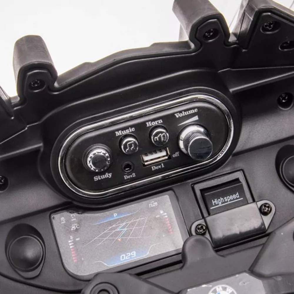 Modern kényelem és vezérlés: A kismotor USB és MP3 csatlakozási lehetőséget kínál, így a gyermekek saját zenei kívánságaikat is betölthetik. A kijelzőn megjelenő akkumulátor jelző segít nyomon követni az üzemidőt, és a hangszórók állítható hangerővel rendelkeznek.