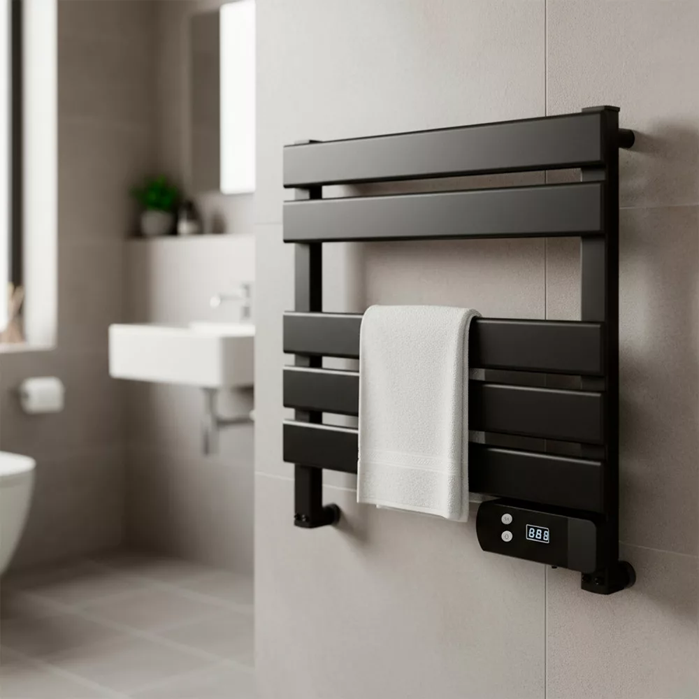 Elektromos törölközőszárító radiátor 150W fekete – halk, energiatakarékos és modern megoldás a fürdőszobába