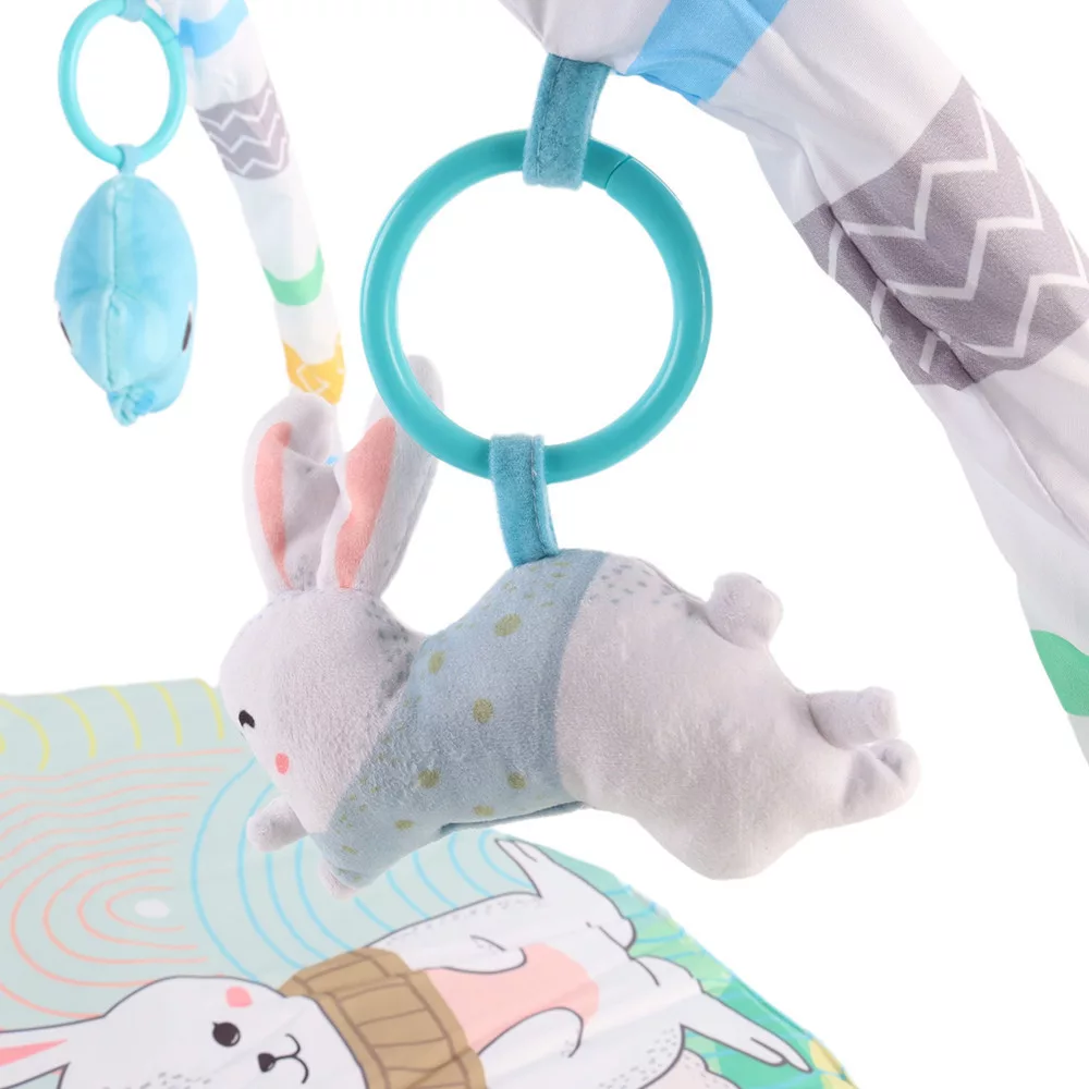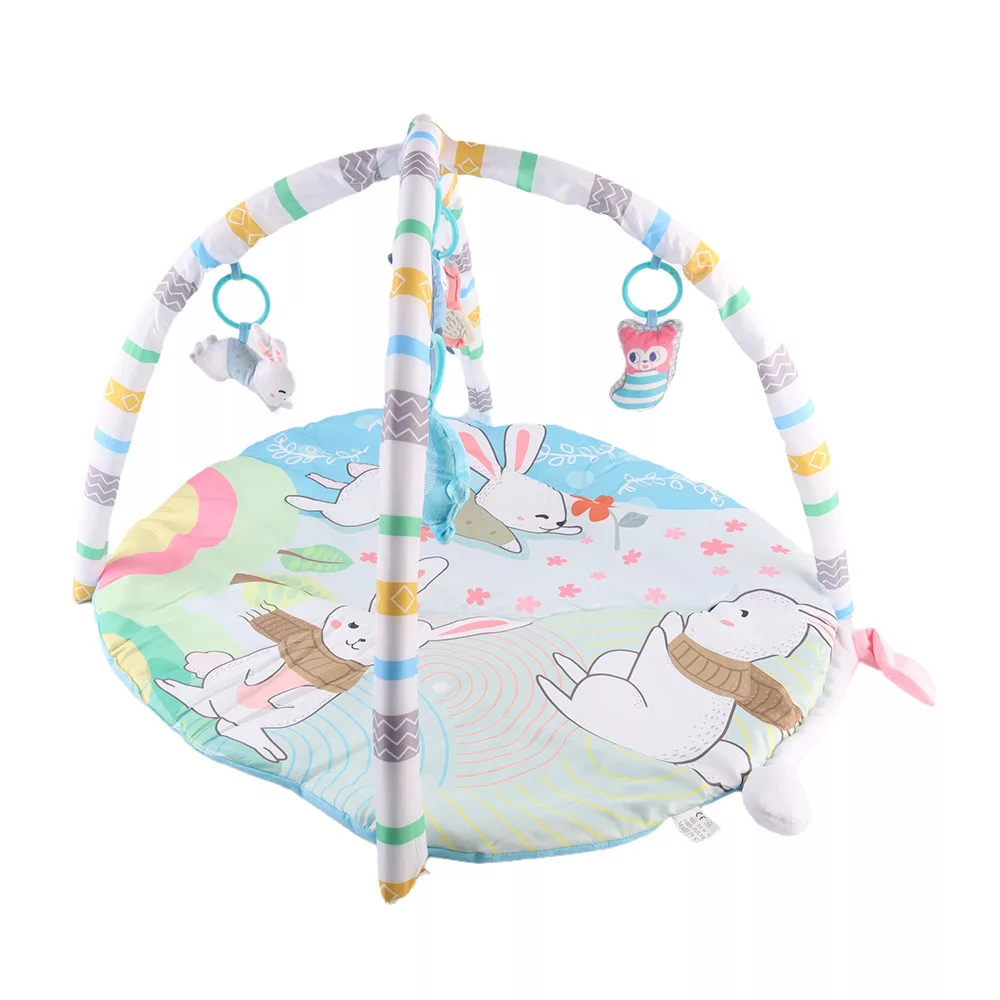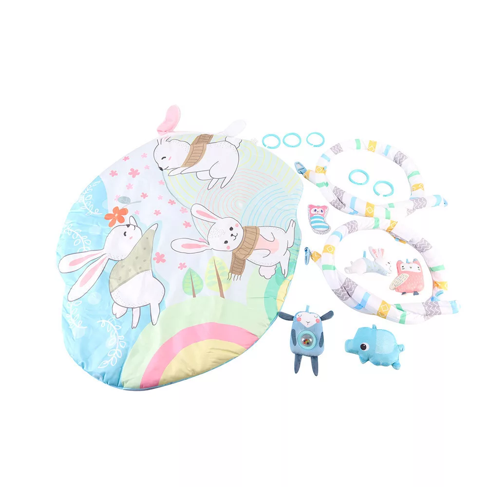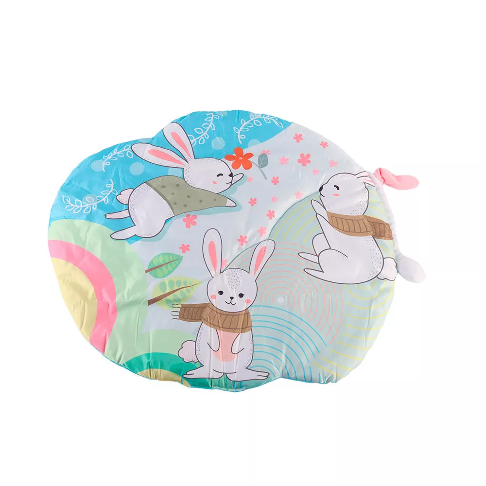 Ez a színes játszószőnyeg tökéletes választás, ha szeretnél egy kényelmes, biztonságos és fejlesztő környezetet biztosítani kisbabádnak. A szőnyeg puha anyagból készült, élénk nyuszis mintákkal, amelyek felkeltik a baba figyelmét. A szőnyeg mérete 92 × 76 cm, így bőven van hely a játékhoz, a párnázott kialakítás pedig kényelmet ad a hason fekvéshez is.