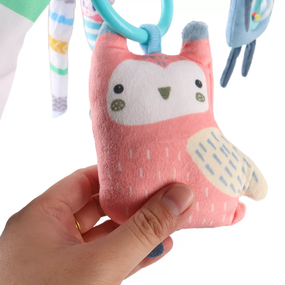 A játékhídon 5 db plüss játék található, köztük nyuszi, bagoly, cica, delfin és egy csörgős bárány figura. A puha játékok levehetők, így külön is használhatók. A játékok különböző textúrái, hangjai és színei fejlesztik a baba látását, hallását és tapintását.