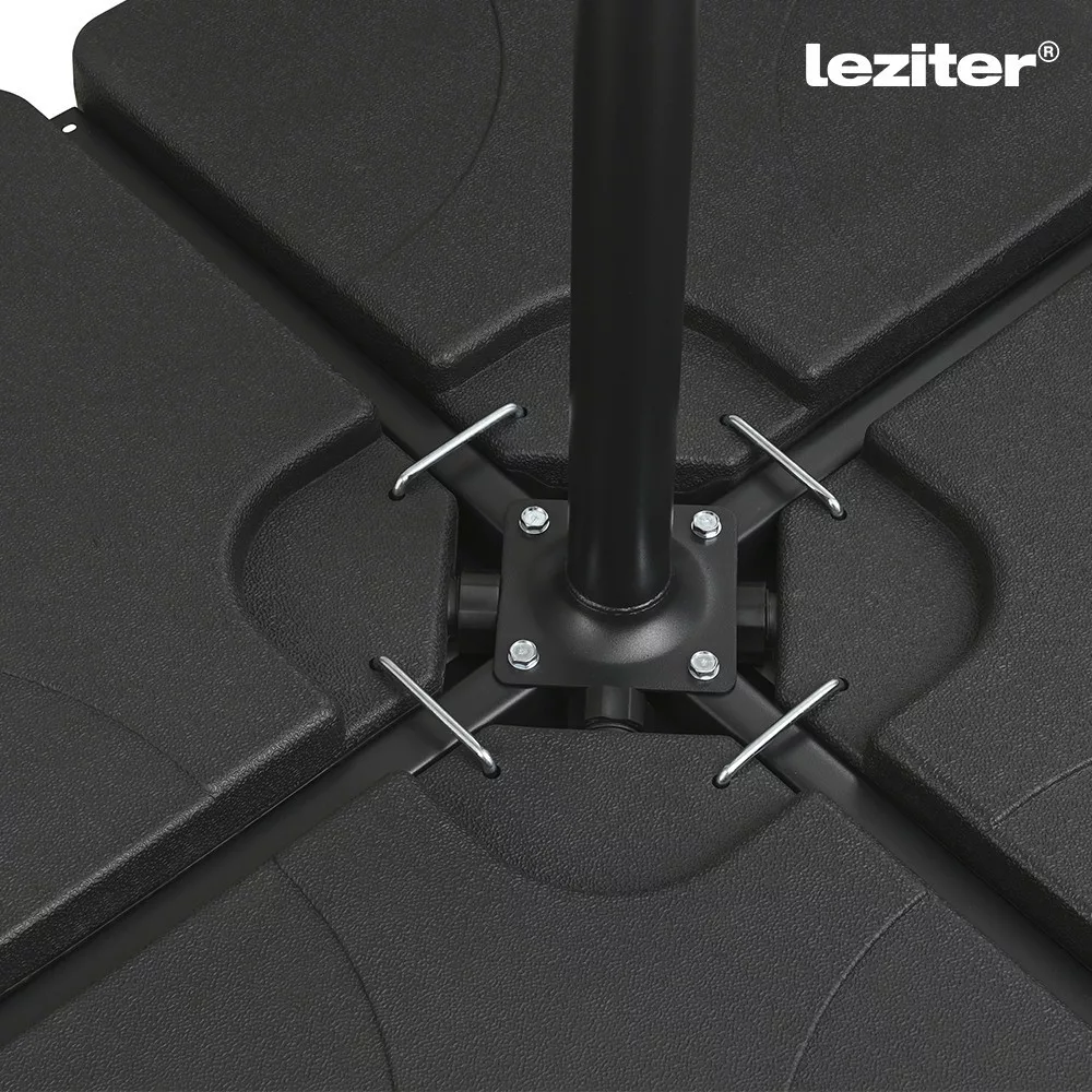 A Leziter Napernyőtalp 4×15 L négy különálló elemből álló, súlyozható megoldás kerti napernyők stabil rögzítéséhez. Az elemek vízzel vagy homokkal tölthetők, így a szükséges terhelés a használati környezethez igazítható. Lapos kialakítása diszkréten illeszkedik teraszokon és kerti burkolatokon, a szett kialakítás pedig megkönnyíti a mozgatást és az elhelyezést.
