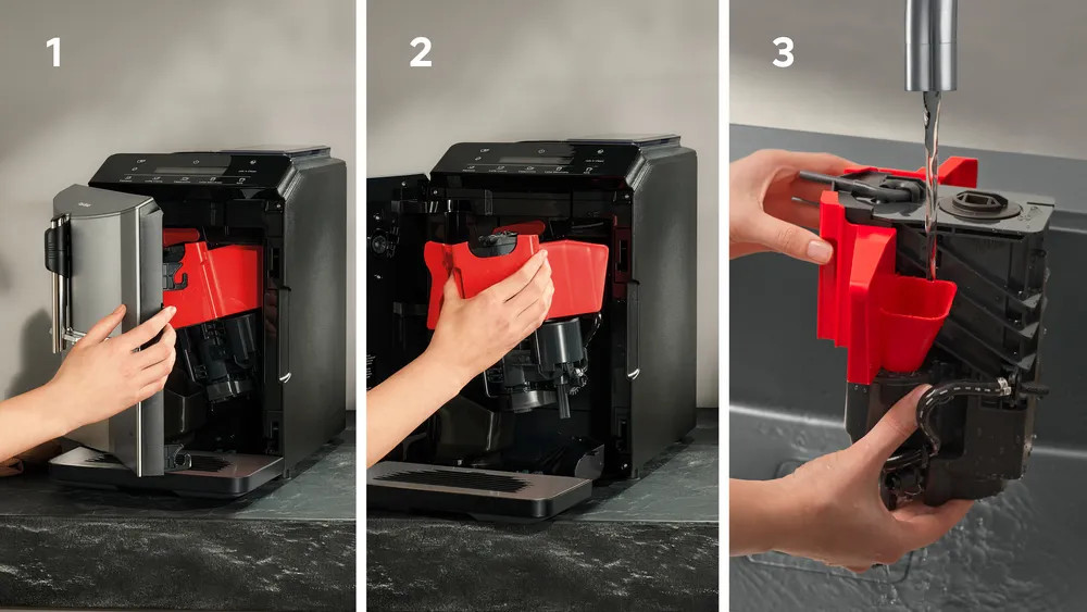 A teljesen kivehető főzőegység a csap alatt elmosható, garantálva a higiéniát és a friss ízt.