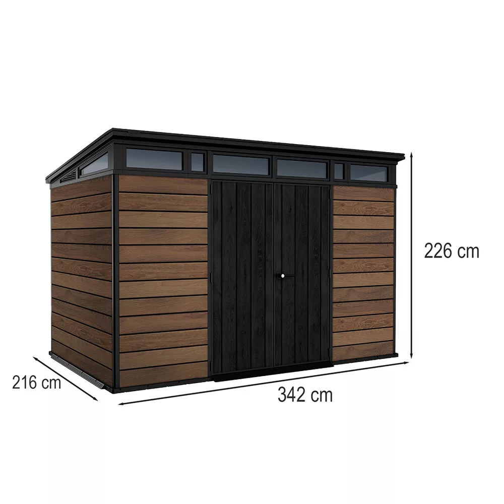 A Signature PENT 11x7 kerti ház ötvözi az esztétikát és a funkcionalitást. A ferde tető és letisztult vonalvezetés tökéletesen illeszkedik a modern kertépítési trendekhez, míg a dió színű DECOCOAT technológia időjárásálló felületet biztosít.